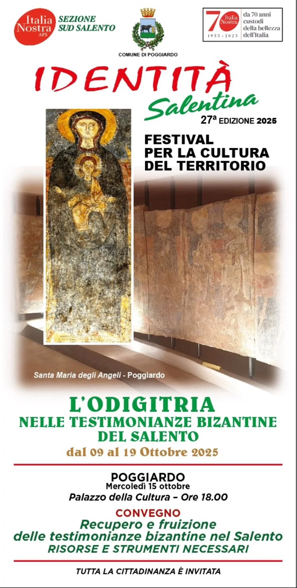 Poggiardo ospiterà un’iniziativa culturale nell’ambito della 27^ edizione di IDENTITÀ SALENTINA, il Festival per la cultura del territorio, organizzato da Italia Nostra – Sezione Sud Salento, associazione che quest’anno festeggia il 70° anniversario della sua fondazione. Il tema conduttore del programma, che ha coinvolto i Comuni di Parabita, Supersano, Poggiardo e Casarano, è L’ODIGITRIA NELLE TESTIMONIANZE BIZANTINE DEL SALENTO.