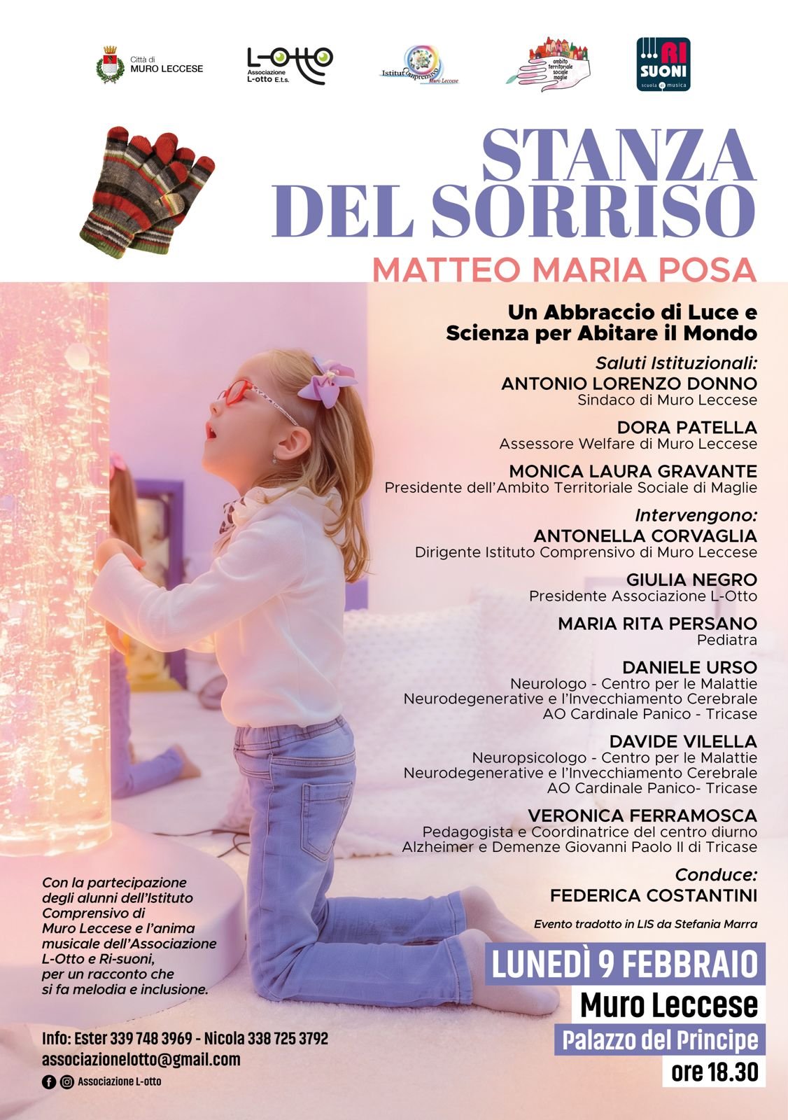 E’ dedicata al piccolo Matteo Maria Posa, andato via troppo presto, la “Stanza del sorriso” che verrà inaugurata domani (lunedì 9 febbraio) alle 18.30 a Muro Leccese, presso il Palazzo del Principe: un luogo dove la luce incontra la scienza per farsi abbraccio, un rifugio progettato per accogliere e stimolare i sensi abbattendo ogni barriera.