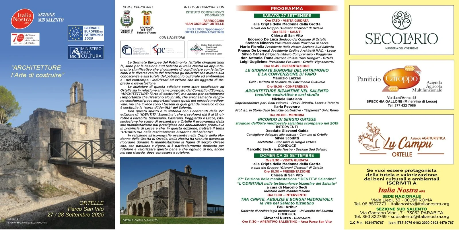 Le Giornate Europee del Patrimonio 2025, promosse dal Ministero della Cultura e organizzate dalla Sezione Sud Salento di Italia Nostra, trovano quest’anno ospitalità a Ortelle, nel Parco San Vito, il 27 e 28 settembre. È un ritorno alla radice, poiché il tema scelto dal Consiglio d’Europa, “Architetture: l’Arte di costruire”, invita non a contemplare i monumenti maggiori, ma a interrogare le architetture “minori”, quelle medievali, bizantine, rupestri: le tessere dimenticate di quel mosaico che compone l’identità del Salento.