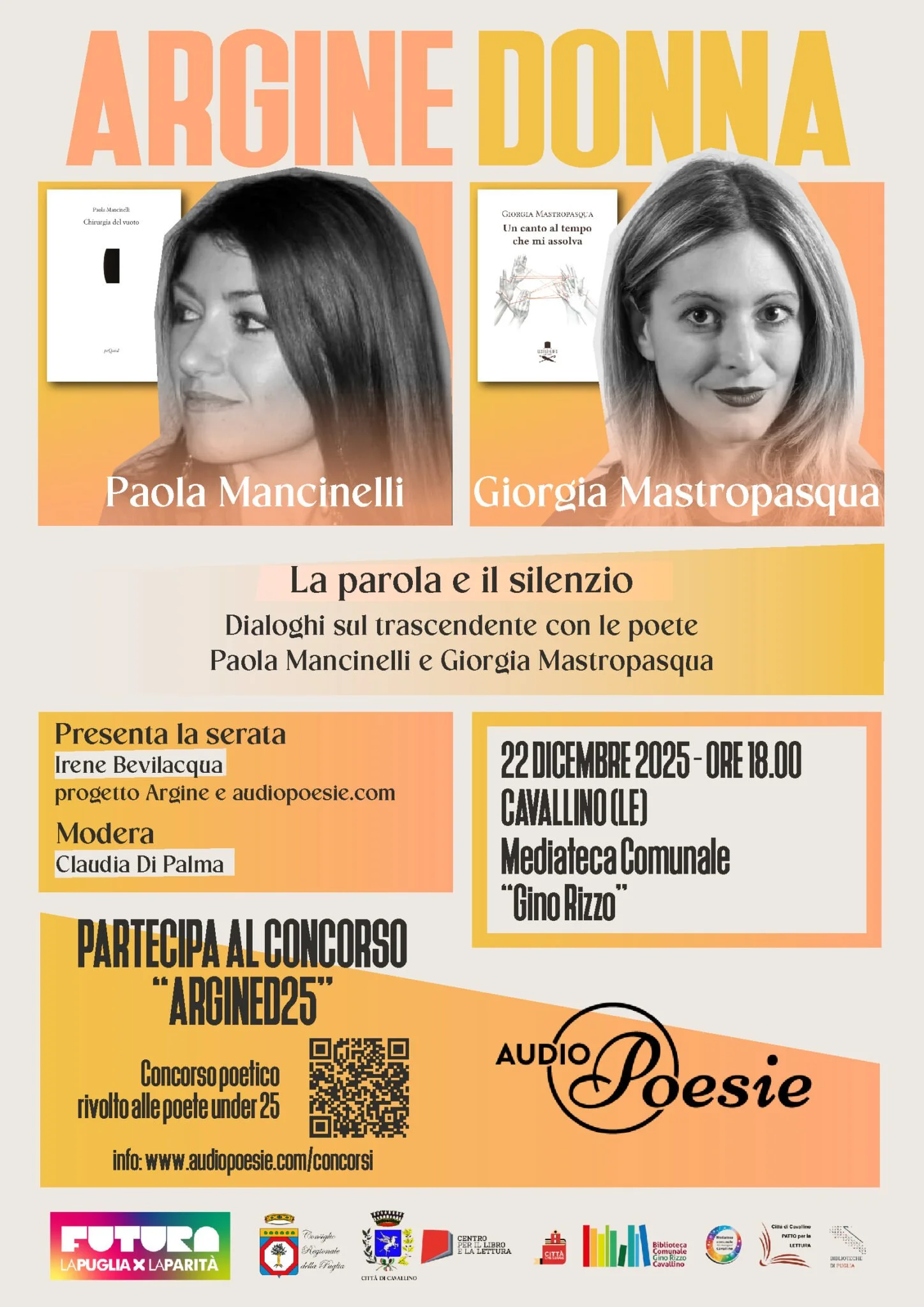 Lunedì 22 dicembre 2025, alle ore 18.00, presso la sala Mediateca Rosa Fuso Martiriggiano di Cavallino (via Principe di Piemonte), si terrà il terzo appuntamento della rassegna “ARGINE DONNA”, a cura del progetto “AudioPoesie.com”. L’incontro, dal titolo “La parola e il silenzio”, sarà dedicato al lavoro poetico delle poetesse Paola Mancinelli e Giorgia Mastropasqua, in un dialogo moderato da Claudia Di Palma (poeta). L’ingresso è gratuito.