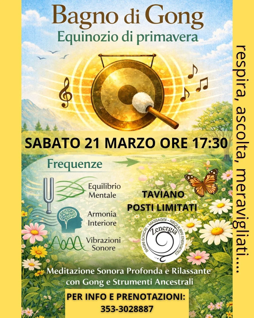 Si celebra l’Equinozio di Primavera domani, sabato 21 marzo, a Taviano, con “Zenergia”, Manuel Verardi e i bagni di gong, le campane tibetane “e tanti altri strumenti ancestrali per sciogliere le tensioni invernali, ridurre lo stress e stimolare nuova energia vitale, un rituale di rinascita che allinea mente e corpo, promuovendo creatività e profondo rilassamento”. Appuntamento alle 17.30 per rigenerarsi totalmente, insomma, perché "La primavera è arrivata, e quando la natura riprende la sua bellezza, anche l’animo umano tende a rinascere" (Harriet Ann Jacobs). Posti limitati, prenotazione necessaria al 353.3028887.