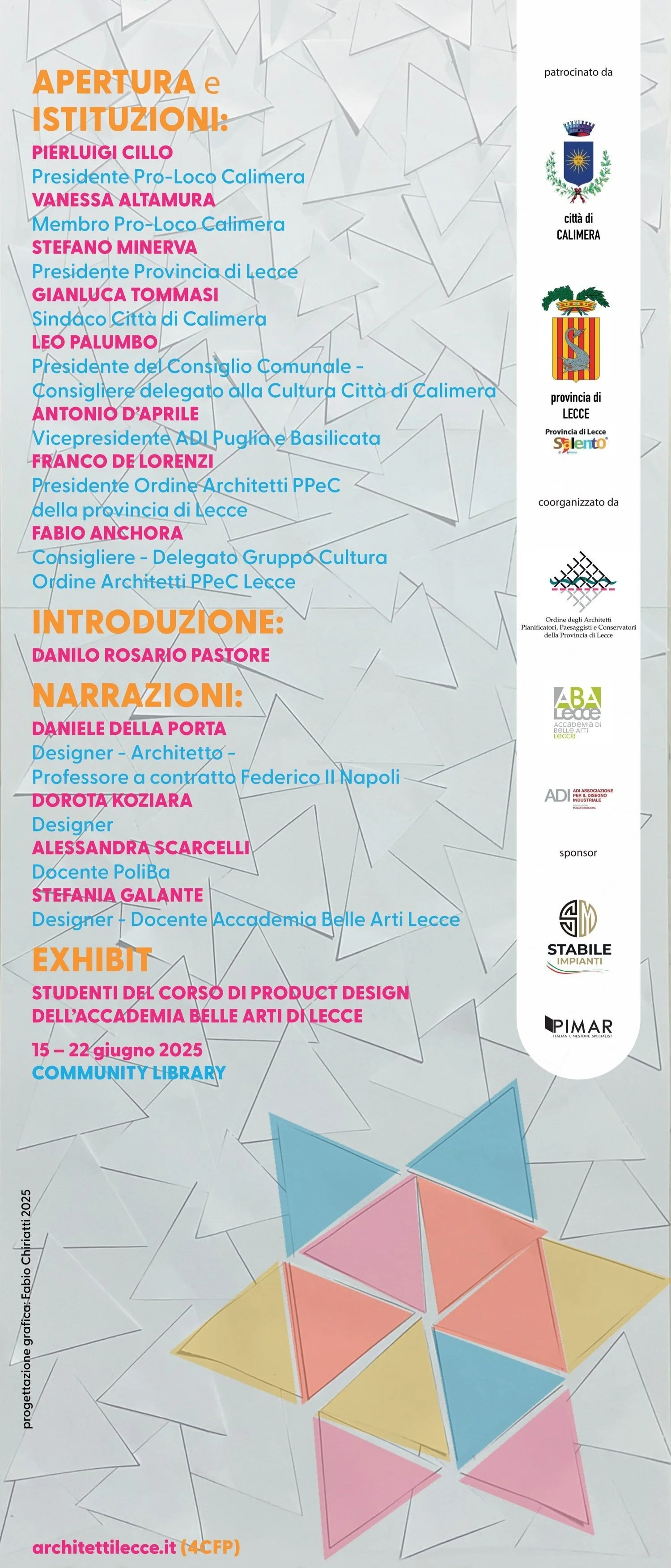 Il momento clou si terrà sabato 15 giugno, a partire dalle 15.30, nella Community Library, con un pomeriggio interamente dedicato al "Design della luce". L’appuntamento – promosso dalla Pro Loco di Calimera in collaborazione con l’Ordine degli Architetti PPC della provincia di Lecce, l’Accademia di Belle Arti di Lecce e la sezione pugliese dell’ADI (Associazione per il Disegno Industriale) – è curato dall’architetto Danilo Pastore, con il patrocinio della Provincia di Lecce e dell’Amministrazione Comunale.