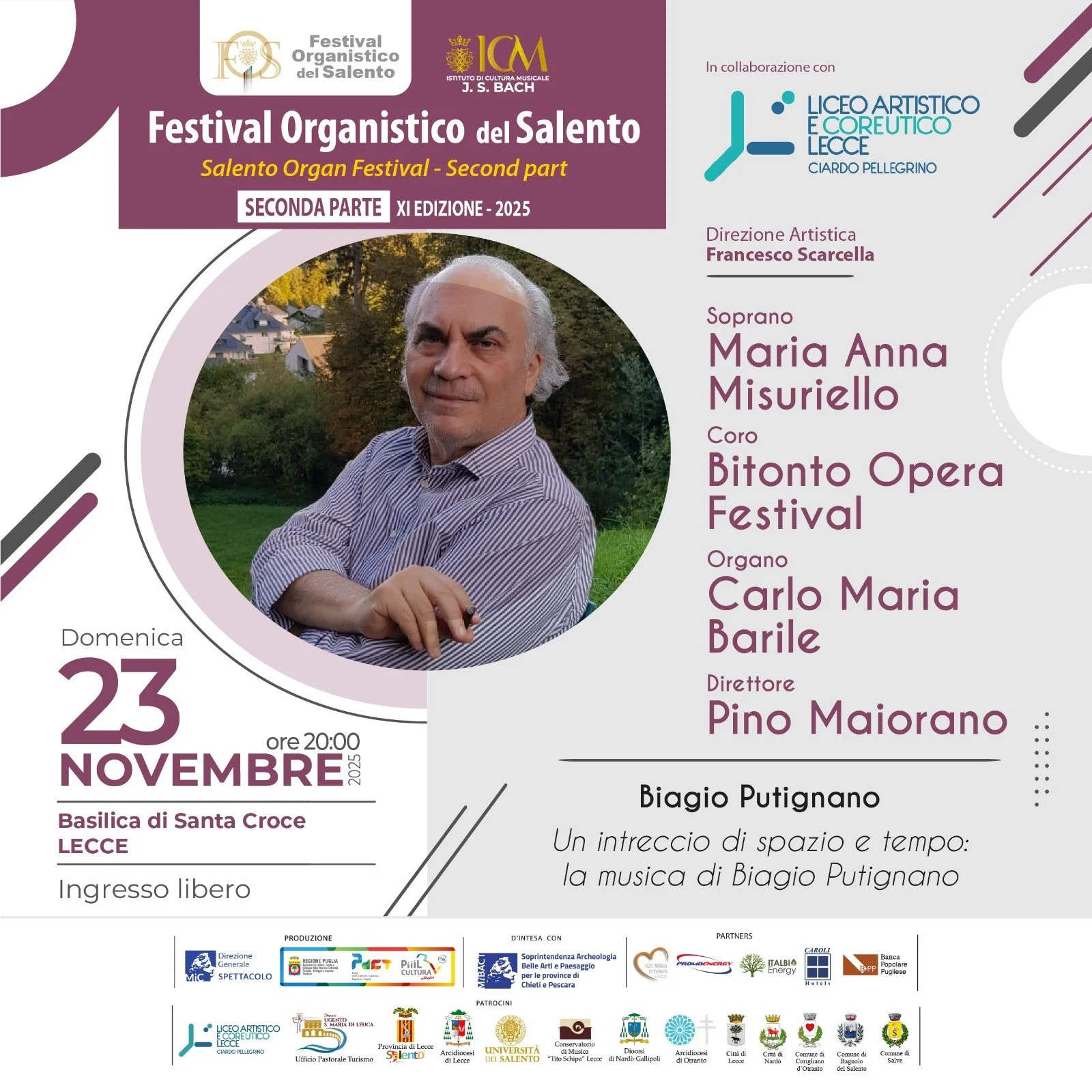 Domenica 23 novembre alle ore 20.00, nella Basilica di Santa Croce a Lecce, concerto dedicato al compositore Biagio Putignano, autore tra i più rilevanti della musica contemporanea italiana, apprezzato per la chiarezza del linguaggio e la profondità della scrittura.