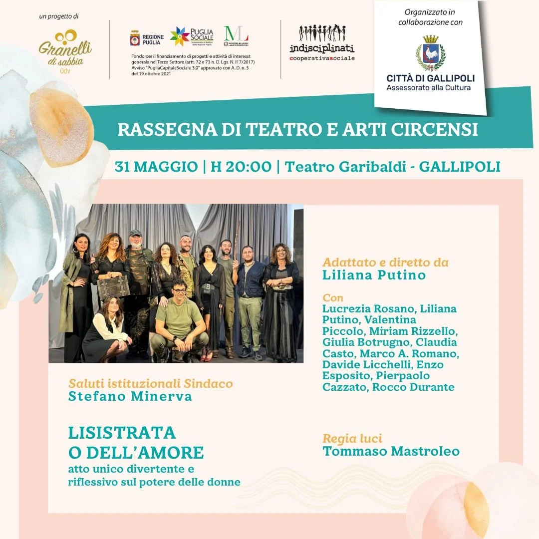 Sabato 31 maggio alle ore 20.00 il Teatro Garibaldi di Gallipoli ospiterà lo spettacolo “Lisistrata o dell’amore”, una moderna e coinvolgente riscrittura della celebre commedia di Aristofane, adattata e diretta da Liliana Putino. Lo spettacolo riflette con ironia e profondità sul potere del femminile e sul valore della pace, temi quanto mai attuali, portati in scena attraverso una miscela di comicità e riflessione sociale.
