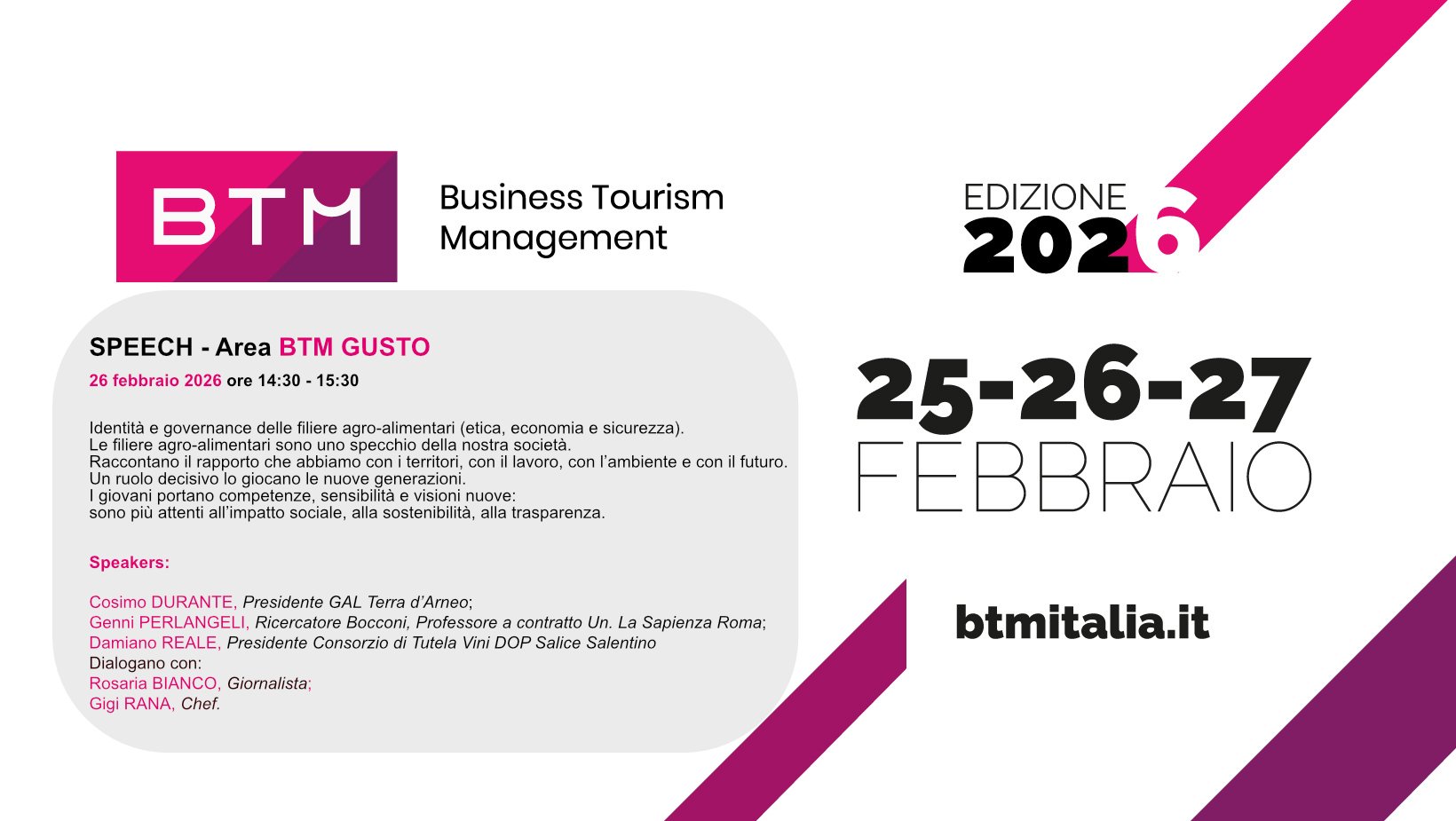 filiere, identità e lavoro di rete per raccontare il territorio Tre giorni per raccontare un territorio che sceglie di fare squadra. Dal 25 al 27 febbraio 2026 il GAL Terra d’Arneo sarà protagonista di BTM Italia – Business Tourism Management, in programma presso la Fiera del Levante, portando a Bari una visione condivisa di sviluppo che intreccia turismo, agroalimentare e identità locale.
