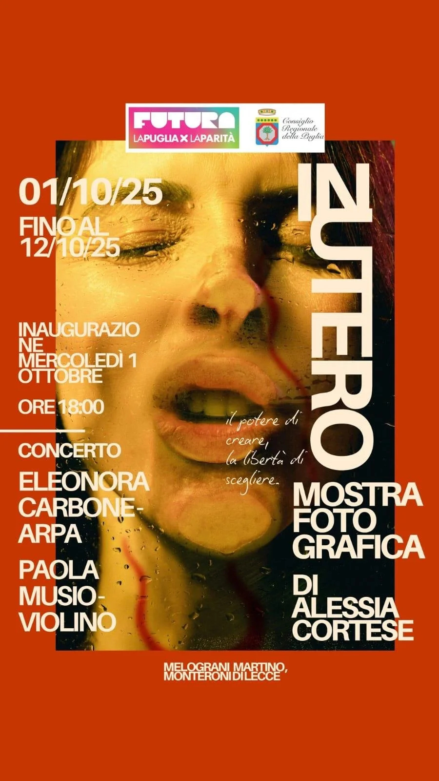 Mercoledì 1 ottobre 2025, alle ore 18.00, si terrà l’inaugurazione di una serie di eventi presso Melograni Martino a Monteroni di Lecce, nell’ambito del bando “Futura La Puglia per la Parità”. Al centro dell’evento inaugurale la mostra fotografica “In Utero” di Alessia Cortese (in esposizione per due settimane) e il concerto delle musiciste Eleonora Carbone (arpa) e Paola Musio (violino).