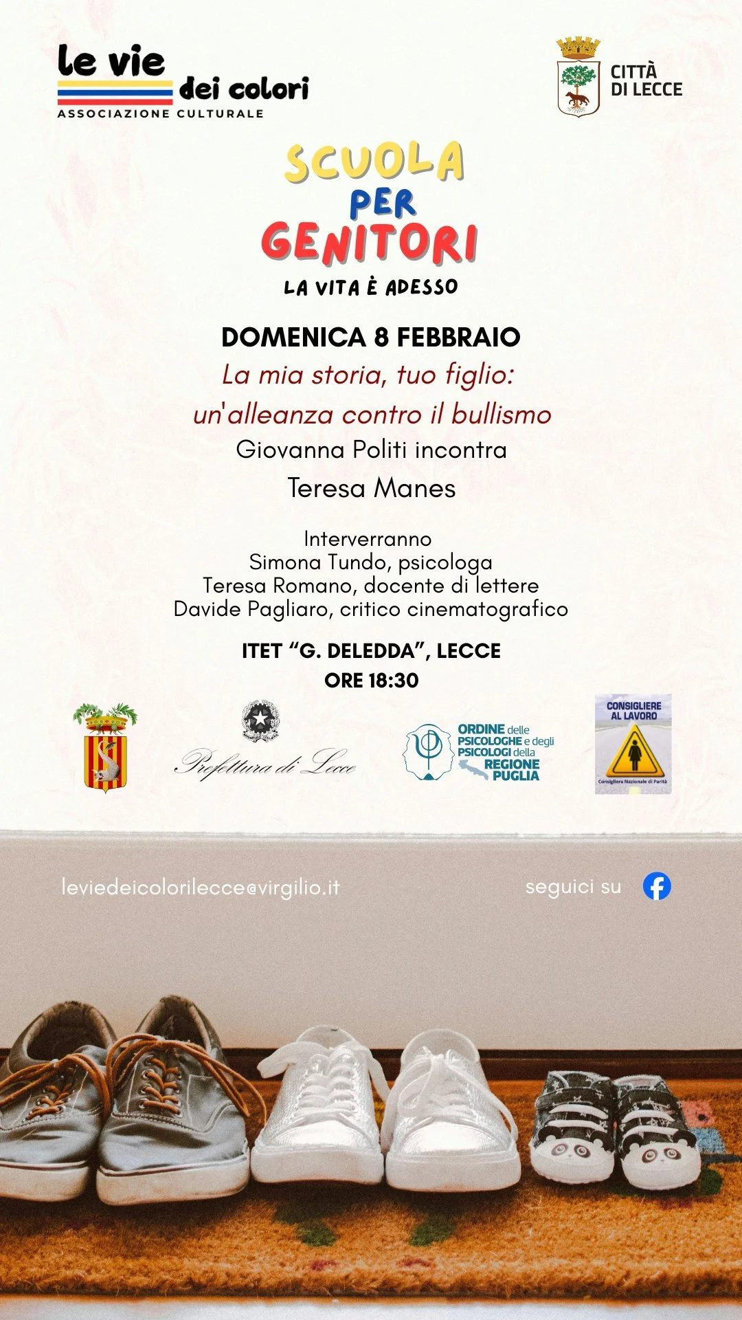 L’appuntamento rientra nel progetto “Scuola per Genitori – La vita è adesso”, promosso dall’Associazione culturale Le Vie dei Colori, in collaborazione con la Prefettura di Lecce, con il patrocinio della Città di Lecce, della Provincia di Lecce, dell’Ordine degli Psicologi della Regione Puglia e della Consigliera Nazionale di Parità.