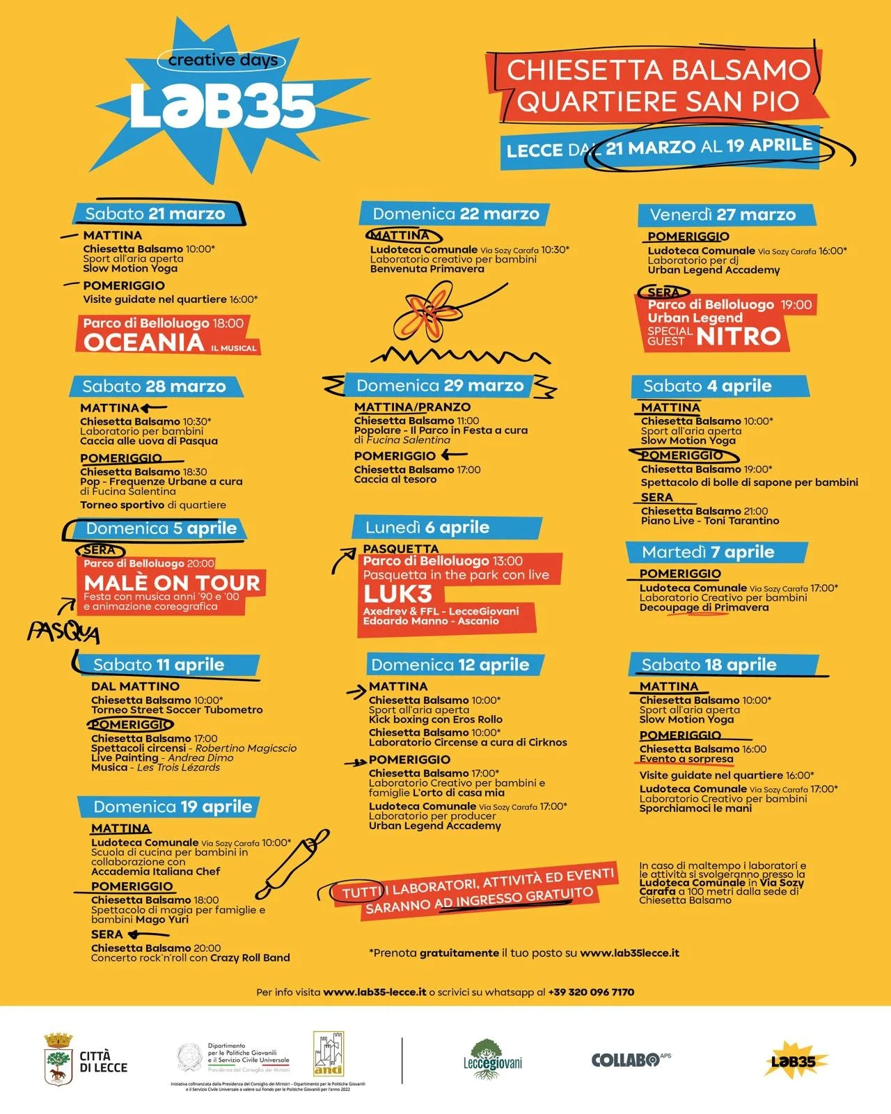 Gli eventi su prenotazione sono indicati con asterisco e prenotabili su www.lab35lecce.it. In caso di maltempo, le attività si svolgeranno presso la Ludoteca Comunale di via Sozy Carafa.