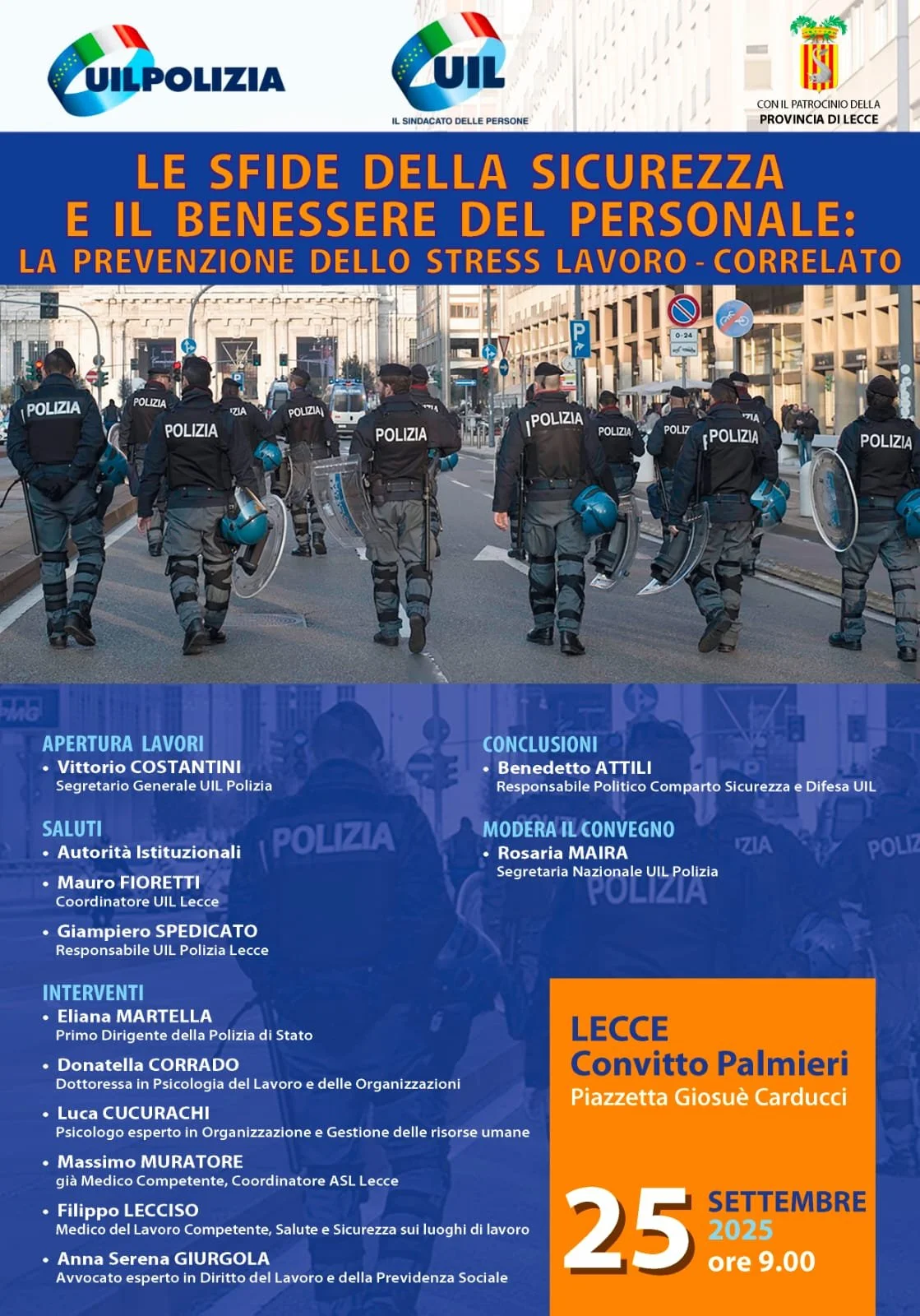L’iniziativa, organizzata dalla UIL Polizia con il patrocinio della Provincia di Lecce, rappresenta un momento di confronto fondamentale per affrontare una delle tematiche più delicate che interessano il comparto sicurezza: la salute psicofisica degli operatori e la gestione dello stress derivante da un’attività lavorativa tanto complessa quanto indispensabile.