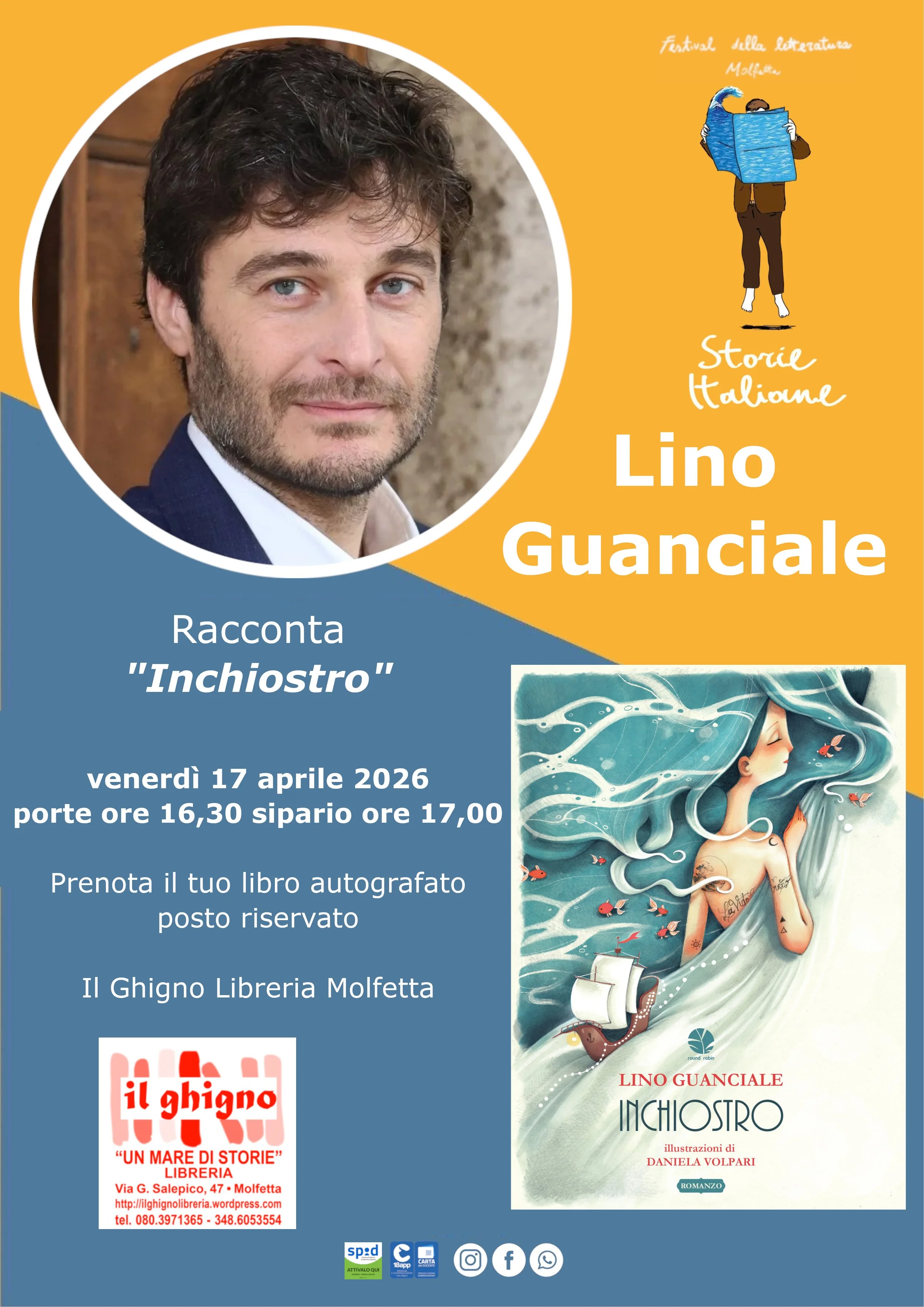L’incontro è parte del Storie Italiane Festival, un progetto culturale ideato e promosso dai librai de “Il Ghigno” che porta autori, scrittori e protagonisti della cultura italiana a Molfetta con incontri e presentazioni.