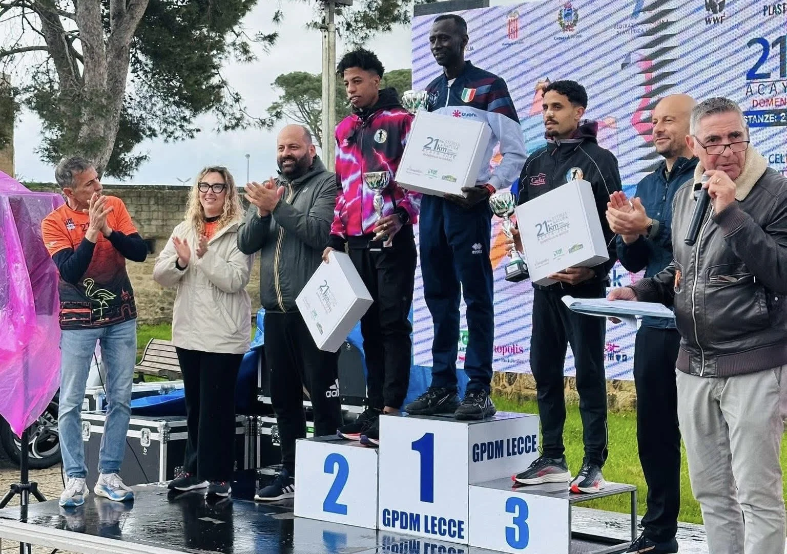 Oltre mille atleti hanno preso parte alla “21km tra Storia e Natura” su ben tre tracciati, che hanno reso speciale la manifestazione giunta alla terza edizione organizzata dalla Asd Gpdm presieduta da Simone Lucia. Alla mezza maratona nazionale, gara principe dell’evento sviluppatasi sulla distanza di 21,097 chilometri, si sono imposti Nfamara Njie della Atletica Casone Noceto e Agnese De Luca della Asd Cursores. Njie ha sbaragliato l’agguerrita concorrenza rendendosi protagonista di una prestazione sontuosa con il tempo di 01:06:29. Gli iscritti hanno attraversato i territori di Acaya, Strudà, Vanze e Acquarica di Lecce dopo essere partiti alle 9 da Largo Castello ad Acaya. Secondo posto per Yahya Kadiri della Carmax Camaldolese col personale di 01:06:34 e terza posizione per il compagno di team Ali Akinou col tempo di 01:09:13. Agnese De Luca invece ha vinto la graduatoria in rosa col tempo di 01:29:26 precedendo in ordine Silvia Palano della Amici Fontana Romano Triggiano e Pamela Greco della Saracenatletica. Per quanto riguarda la 12,5 chilometri nazionale competitiva, hanno primeggiato Giammarco Buttazzo della Buttazzo Runners col tempo di 42:20 e Luana Boellis della Podistica Magliese col tempo di 50:51. La competizione autorizzata dal Coni e dalla Federazione italiana di atletica leggera, si è svolta in occasione del 13esimo Trofeo Cavaliere Gaetano Quarta. Durante l’evento sportivo è scattata anche la Family Run Acaya, gara non competitiva sulla distanza di 7,5 chilometri, che ha appassionato principianti e amanti dello sport open air. L’evento si è svolto sotto il controllo delle Forze dell’Ordine, della Protezione Civile e del Gruppo Giudici gare della Federazione italiana di atletica leggera. A margine delle gare si è tenuta la cerimonia di premiazione con Nfamara Njie e Agnese De Luca sugli scudi. L’anno scorso si issarono sul gradino più alto del podio Jean Butoyi della Bitonto Runners ed Elisa Rullo della Olimpiatletica. La manifestazione è stata patrocinata dal Comune di Vernole, della Provincia di Lecce e della Regione Puglia.