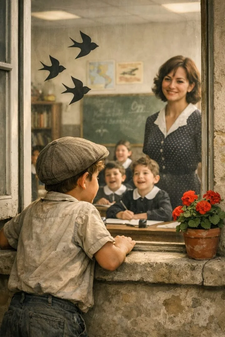 Le melodie canore nella seconda C delle elementari si diffondevano nel corridoio della scuola e, mirabile a dirsi, anche all’esterno dell’edificio. La finestra dell’aula veniva lasciata aperta, tempo permettendo, perché la maestra intendeva attenuare la sensazione di totale separazione col mondo fuori. Esisteva ancora lo stacco netto delle stagioni, ma nel Salento non si manifestava con punte di caldo esagerato d’estate e troppo fredde d’inverno. La primavera era lunga e sfumata. Tuttavia, la pungente temperatura pre-estiva di maggio si faceva sentire. Si rimediava con la ventilazione. L’aria fresca entrava dalla finestra, attraversava l’aula, il lungo corridoio interno e confluiva verso il portone aperto sul grande giardino dell’edificio. Sui vetri delle finestre, ordinate in una lunga e fitta scia, saettavano festose le rondini nere, ritagliate dalle foderine dei quaderni per gli esercizi in classe. Facevano la loro comparsa dopo le vacanze pasquali a seguito di un piacevole lavoro di matite, forbici e colla. Aiutavano gli alunni a dimenticare la Pasquetta di qualche tempo prima, la totale libertà negli spazi all’aperto e rendevano l’aula della seconda C ancora più attraente e veramente fortunati gli ospiti. Con l’aria esterna che proveniva dalla finestra e portava con sé i lievi rumori dei passi, il chiacchiericcio stradale e i veloci saluti tra i passanti, gli alunni non si sentivano in uno spazio a parte, al di là dal mondo. Continuavano a respirare il clima di libertà di chi stava fuori.