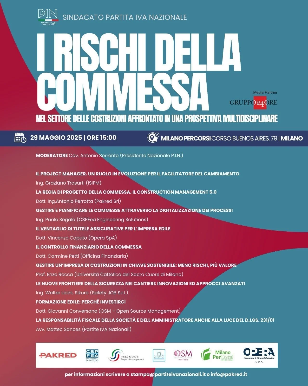 Domani, 29 maggio alle ore 15:00, presso la sede di Milano Percorsi in Corso Buenos Aires 79, si svolgerà la convention nazionale intitolata “I Rischi della Commessa – Nel settore delle costruzioni affrontato in una prospettiva multidisciplinare”, promossa dal Sindacato Partite IVA Nazionale (PIN) e patrocinata da importanti realtà del settore.