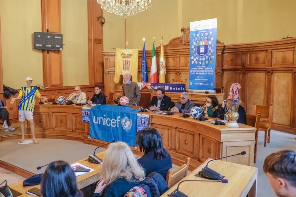 Stamani, a Palazzo dei Celestini a Lecce, nell’aula consiliare della Provincia, si è svolta la conferenza stampa di presentazione del Trofeo. A fare gli onori di casa il presidente dell’Ente provinciale Fabio Tarantino che ha ricevuto i rappresentanti della FIGC, del CONI, dei Comuni che ospiteranno le gare e i rappresentanti dei Consigli comunali dei Ragazzi e delle Ragazze e di UNICEF. A testimonianza tangibile poi del percorso che il calcio giovanile può portare alcuni ragazzi ai massimi livelli del professionismo, alla conferenza stampa era presente la delegazione del Casarano calcio, guidata dal dirigente Marco Carrozzo con i calciatori della Primavera rossazzurra Francesco Amato che ha rivolto un apprezzato saluto ai ragazzi presenti, Luigi Lubes, Mattia Ingrosso, Fabio Leucci, Francesco De Fano, Momo. Presenti anche due calciatori della Primavera del Lecce.
