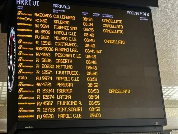 Sono 23 i treni cancellati a Roma Termini, visibili nella schermata 'arrivi' della stazione Termini di Roma, dalle 9 di mattina alle 12.45 per lo sciopero dei ferrovieri proclamato dai sindacati di base dalle 21 di ieri sera e fino alle 18.00 di oggi.