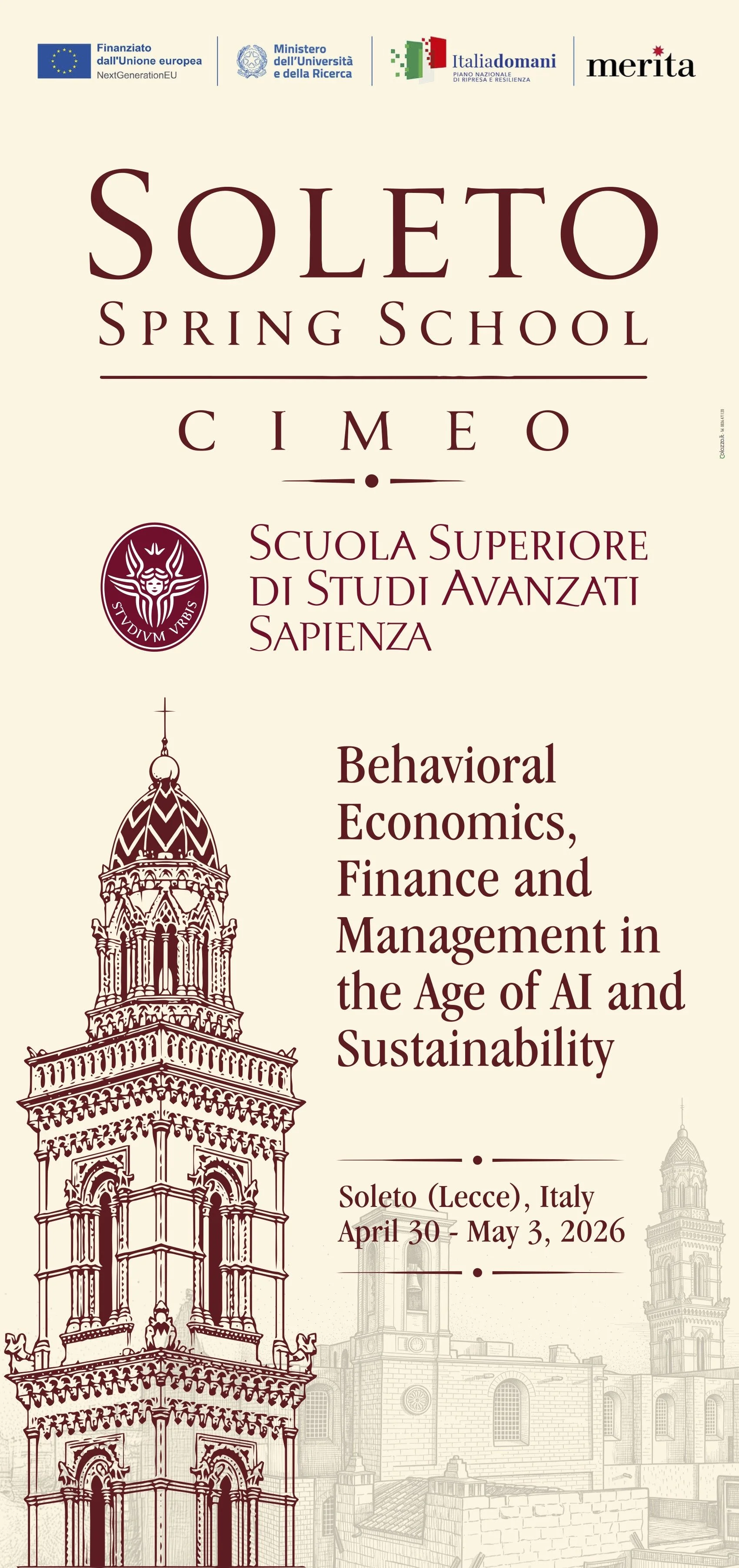 Dal 30 aprile al 3 maggio 2026, Soleto, nel cuore della Grecìa Salentina, ospiterà la quarta edizione della Soleto Spring School che avrà per tema ‘Behavioral Economics, Finance and Management in the Age of AI & Sustainability’. Un evento accademico di caratura internazionale, promosso dalla Sapienza Università di Roma – Scuola Superiore di Studi Avanzati Sapienza, nell’ambito del progetto MERITA e organizzato dal professore Giuseppe Attanasi, originario di Soleto.