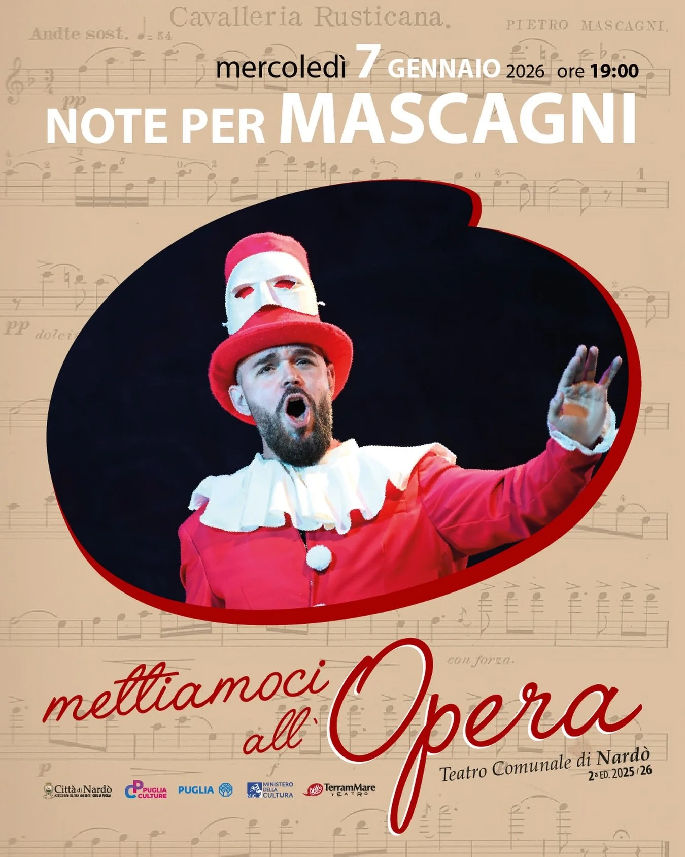 Con “Note per Mascagni” si apre il 2026 della 16ª Stagione teatrale del Teatro Comunale di Nardò. Appuntamento mercoledì 7 gennaio 2026 alle ore 19:00. Si tratta del terzo appuntamento della sezione di concerti lirico-musicali METTIAMOCI ALL’OPERA.