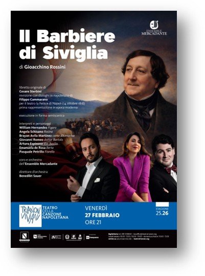 prima rappresentazione in epoca moderna esecuzione in forma semiscenica interpreti e personaggi William Hernandez Figaro, Angela Schisano Rosina Brayan Avila Martinez conte d’Almaviva, Giovanni Romeo dottor Bartolo, Arturo Espinosa don Basilio, Emanuela de Rosa Berta, Pasquale Petrillo Fiorello, coro e orchestra dell’Ensemble Mercadante, violino di spalla Giacomo Mirra direttore d’orchestra Benedikt Sauer, opera venerdì 27 febbraio, ore 21