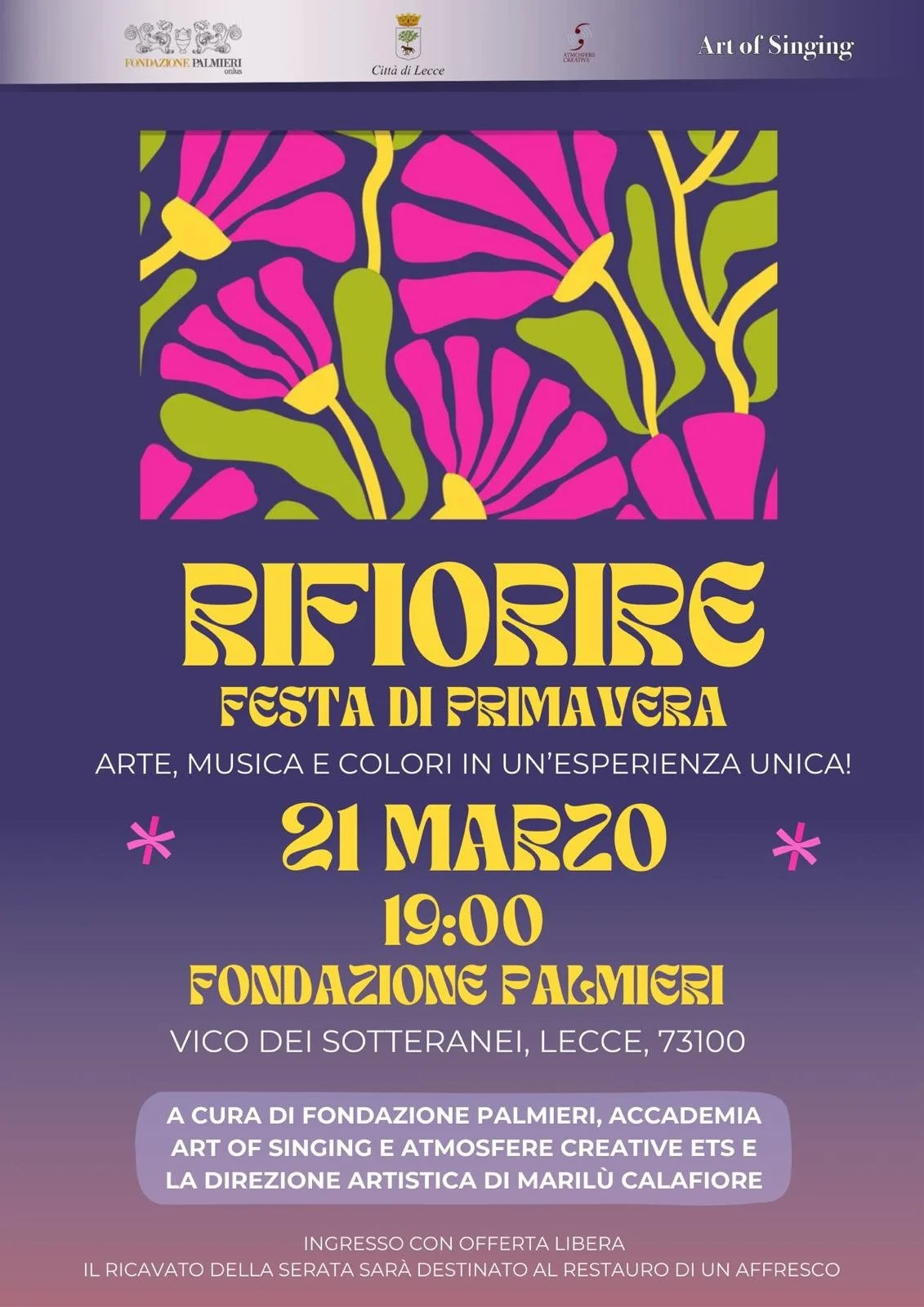 Il 21 marzo alle 19 la Fondazione Palmieri di Lecce ospiterà “RIFIORIRE – Festa di Primavera”, un evento dedicato all’arte, alla musica e alla rinascita culturale. La serata, organizzata e presentata da Marilù Calafiore con l’obiettivo di sostenere il restauro dell’affresco “L’Adorazione di San Francesco”, custodito all’interno della Fondazione, nasce come un momento di incontro in cui la creatività diventa uno strumento concreto per sostenere e preservare il patrimonio culturale. Ed è realizzata in collaborazione con l’associazione “Atmosfere creative”.