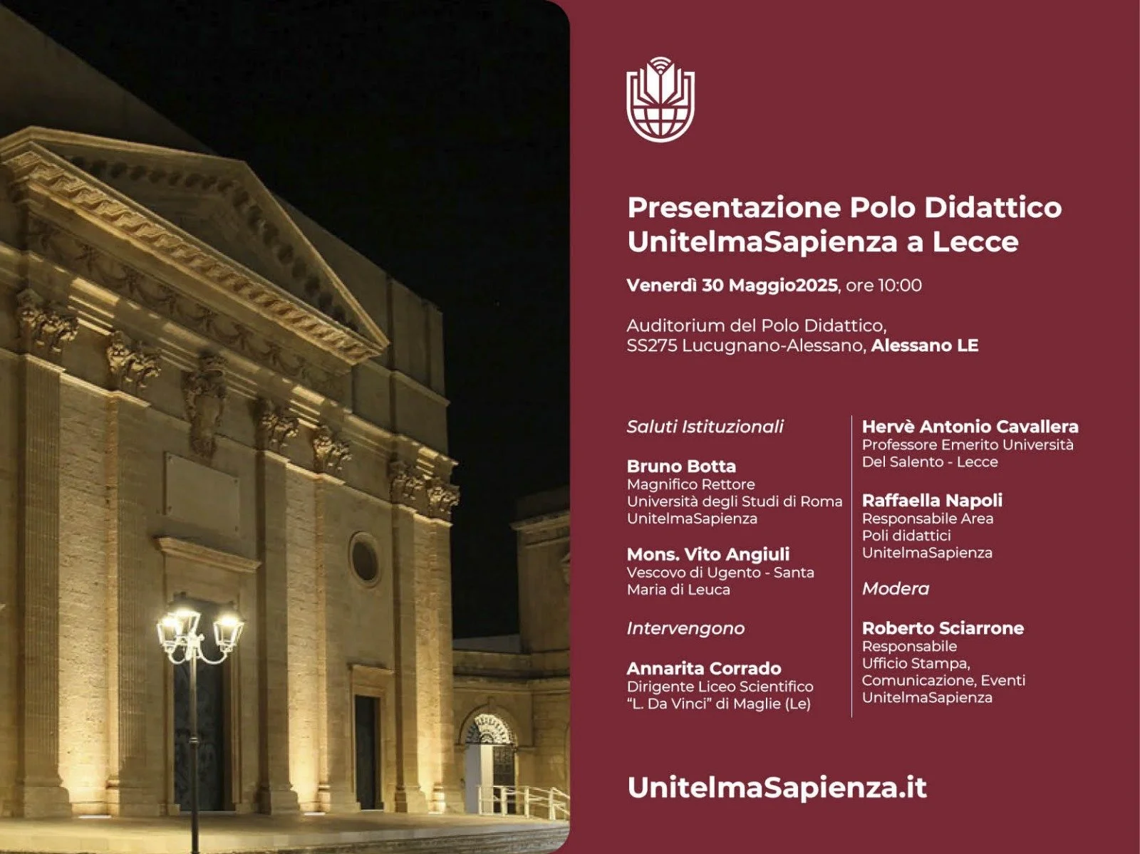 LUniversità degli Studi di Roma UnitelmaSapienza è lieta di annunciare lincontro di presentazione del nuovo Polo Didattico ad Alessano, in provincia di Lecce. La cerimonia di presentazione si terrà venerdì 30 maggio 2025 alle ore 10:00 presso l’Auditorium del Polo didattico, SS275 Lucugnano-Alessano. Porteranno i saluti istituzionali Bruno Botta, Magnifico Rettore dellUniversità degli Studi di Roma UnitelmaSapienza e S.E. Mons. Vito Angiuli, Vescovo di Ugento – Santa Maria di Leuca. Seguiranno gli interventi di Annarita Corrado, Dirigente Liceo Scientifico Leonardo Da Vinci Di Maglie (Le); Hervè Antonio Cavallera, Professore Emerito presso l’Università del Salento; Raffaella Napoli, Responsabile Area Poli didattici, Promozione e Job Placement. Lincontro sarà moderato da Roberto Sciarrone, Responsabile Ufficio Stampa, Comunicazione, Cerimoniale di UnitelmaSapienza che ne ha curato l’organizzazione insieme al Polo. Lapertura del nuovo polo didattico di UnitelmaSapienza rappresenta un’opportunità per giovani e professionisti salentini di ottenere una formazione accessibile e di qualità. Alessano e la provincia di Lecce si arricchiscono di una sede desame in presenza per gli studenti iscritti ai corsi di laurea. Sono inoltre previste iniziative di orientamento per promuovere lofferta formativa e promozion i riservate agli studenti.