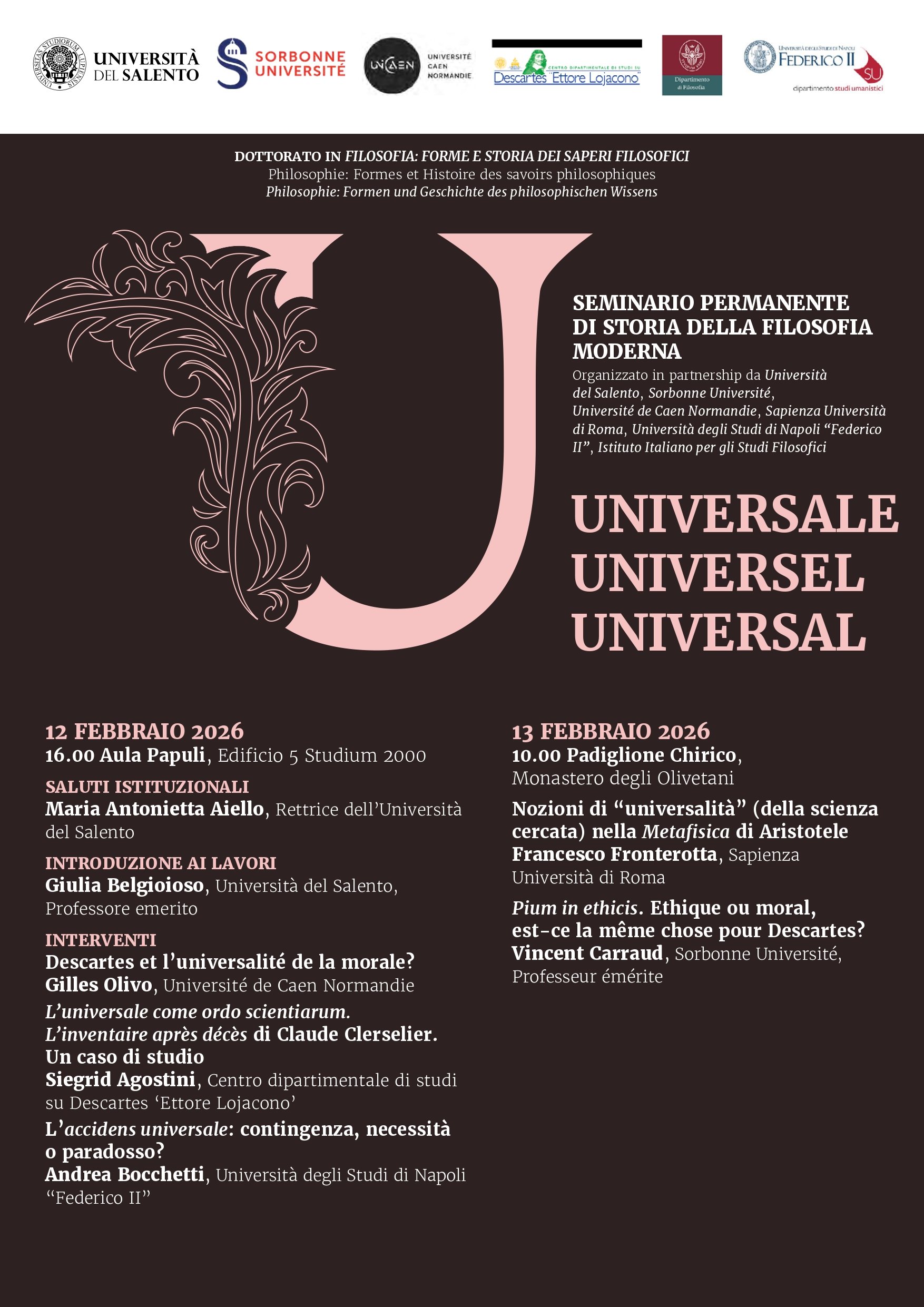 Dal 10 al 13 febbraio all’Università del Salento si terrà la sessione di filosofia moderna del Dottorato in Filosofia intitolata “Universale / Universel / Universal”. La sessione si propone di indagare, da una prospettiva storica e teoretica, il problema dell’universalità nel pensiero filosofico moderno, attraverso un confronto interdisciplinare che coinvolge studiosi, ricercatori e dottorandi provenienti da diverse istituzioni accademiche italiane ed europee.