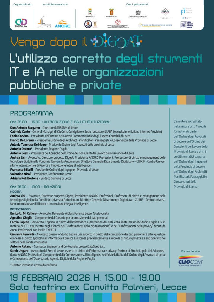 Su questi temi si concentrerà il convegno “Vengo dopo il DIGEAT – L’utilizzo corretto degli strumenti IT e di IA nelle organizzazioni pubbliche e private”, in programma mercoledì 19 febbraio 2026, dalle ore 15:00 alle 19:00, presso la Sala Teatrino dell’Ex Convitto Palmieri di Lecce.