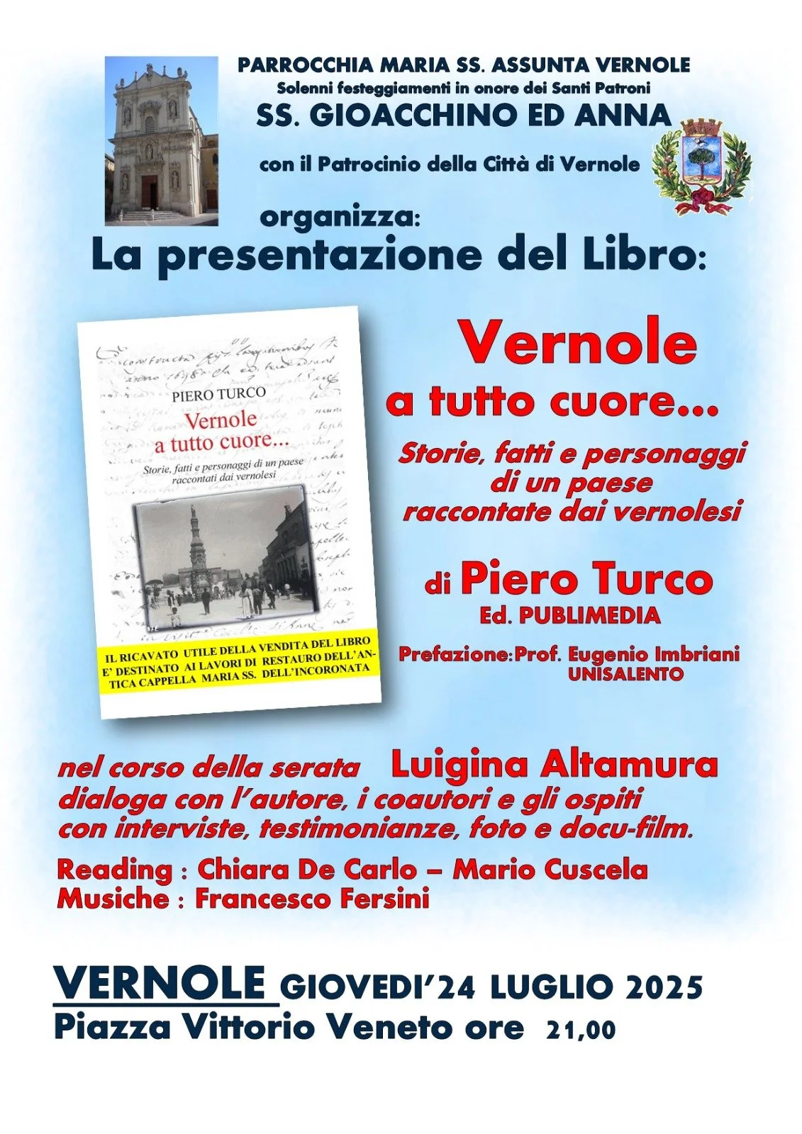 L’iniziativa si inserisce nel solenne programma dei festeggiamenti dedicati ai SS. Protettori Gioacchino e Anna, con il patrocinio della Città di Vernole e il sostegno della Parrocchia Maria SS. Assunta, guidata dal Parroco Don Leonardo Giannone. Il ricavato delle vendite del libro sarà destinato al completamento dei lavori della Cappella di Maria SS. Incoronata, uno degli edifici sacri più antichi e significativi della comunità, rafforzando così il legame tra cultura, fede e impegno sociale.