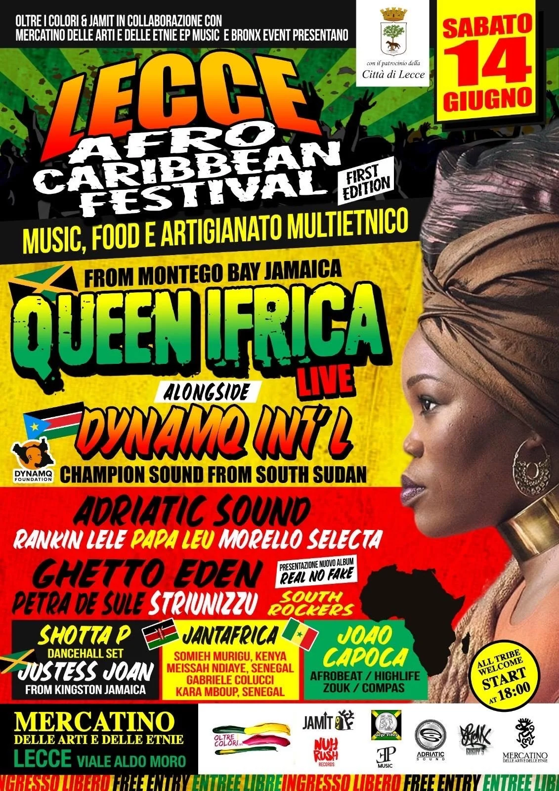 Un evento che celebra la cultura africana e caraibica che si svolgerà nel cuore di Lecce, nel giardino del Mercatino delle Arti e delle Etnie, con il patrocinio del Comune di Lecce e con la partecipazione di associazioni di volontariato e della comunità africana e caraibica presente nel territorio. Ospite speciale dell’evento la famosa artista jamaicana Queen Ifrica per la prima volta nel Salento che, con il suo inconfondibile stile roots-reggae, sarà accompagnata dal sud-sudanese Dinamq Sound, dj ufficiale del suo tour mondiale.